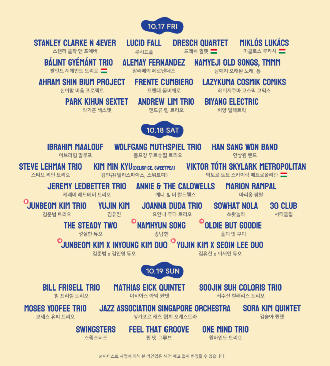 - STANLEY CLARKE N 4EVER (10/17 금): 재즈 퓨전의 살아있는 전설, 베이시스트 스탠리 클라크의 파워풀한 무대는 놓칠 수 없는 하이라이트예요.