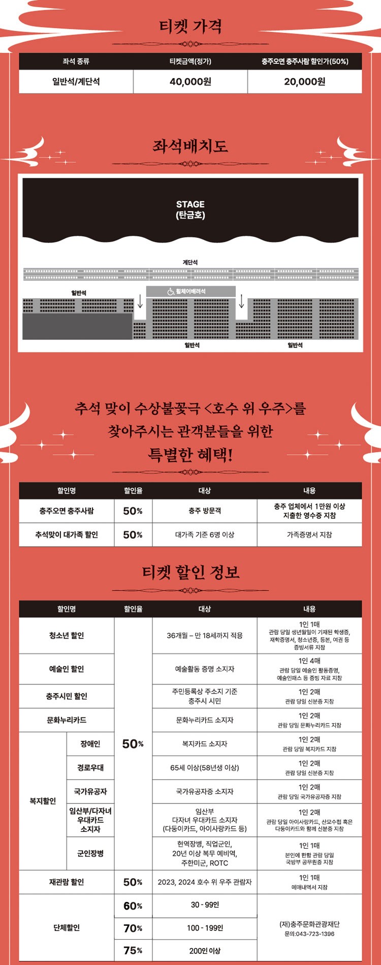 | 입장료/예약 | 유료 (일반석 4만원 / 충주시민 50% 할인) / 예매는 Nol티켓(구 인터파크 티켓) (연합뉴스, 2025) |