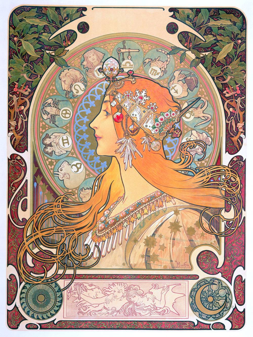 파리 시절의 하이라이트는 단연, 무하를 '단 하룻밤 만에 스타'로 만든 전설적인 작품 '지스몽다(Gismonda)' 포스터예요. 프랑스의 유명 배우 사라 베르나르(Sarah Bernhardt)를 위한 공연 포스터인데, 이전 포스터들과는 완전히 다른 혁신적인 디자인을 선보였답니다. 길고 세련된 세로 구도, 그리스 로마 신화에서 영감을 받은 듯한 장식적 요소, 그리고 여성의 신비로운 매력을 극대화한 이 포스터는 당대 파리 예술계를 뒤흔들었습니다. 이와 더불어, 우아한 여인들이 사계절, 꽃, 보석 등을 상징하는 연작 포스터와 <황도 12궁(Zodiac, 1896)>과 같은 달력 디자인도 꼭 감상해야 할 필수 코스입니다. 무하의 상업 예술은 단순히 광고를 넘어 '일상 속 예술'이라는 아르누보의 정신을 실현했답니다.