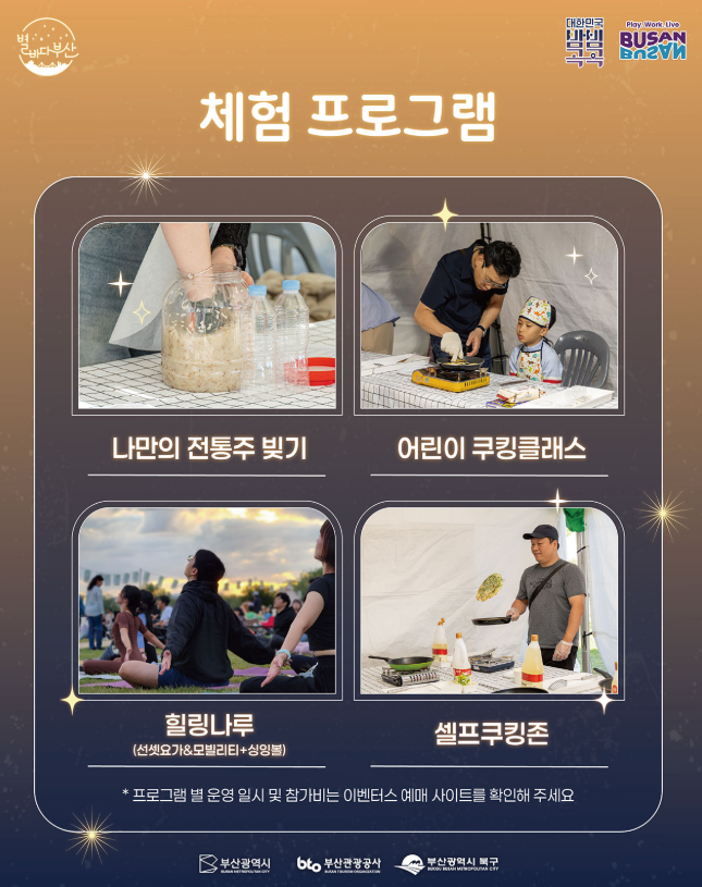 별바다 나이트마켓은 미식과 야경 외에도 여행의 만족도를 높이는 다양한 체험 프로그램을 갖추고 있습니다. '밤마실 부뚜막' 존은 여행에 지친 몸과 마음을 달래는 힐링 프로그램과 흥미진진한 쿠킹 클래스로 가득합니다.