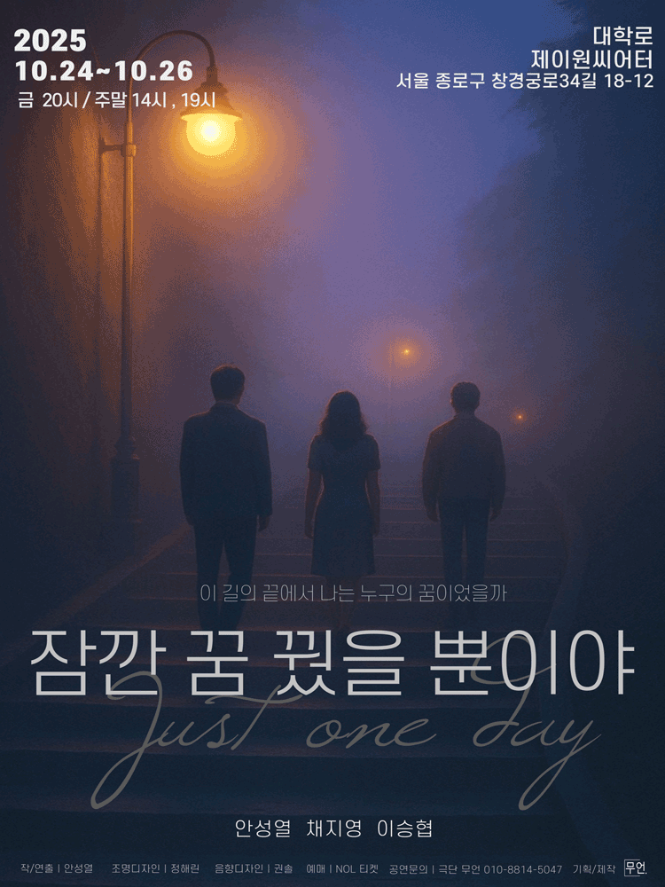 - 작품 소개: 극단 무언의 창작 연극으로, 현실과 환상 사이의 모호한 경계를 그려낸 독특한 작품입니다. 주인공이 겪는 낯선 경험들이 과연 꿈인지 현실인지 관객 스스로가 판단하도록 유도하며, 관객들에게 상상력과 해석의 자유를 부여합니다.